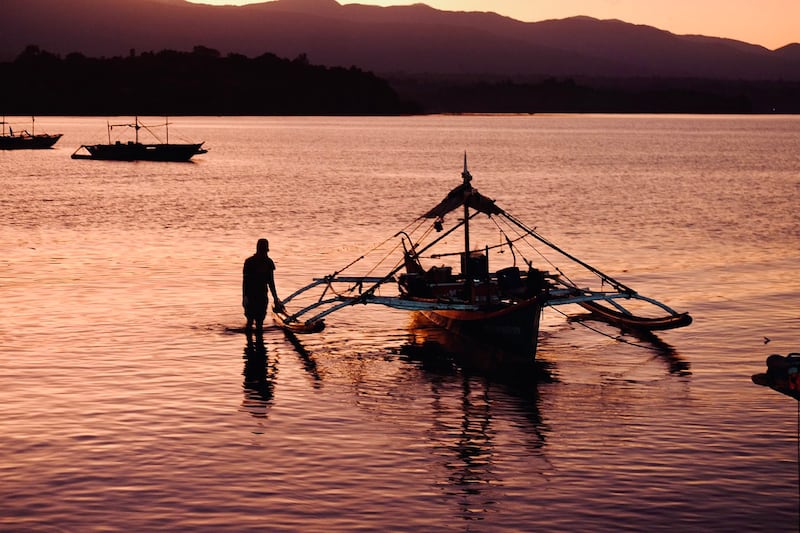 A fisherman positions his boat after unloading his catch at dawn in Masinloc, Feb 27, 2024. (Jason Gutierrez/BenarNews)